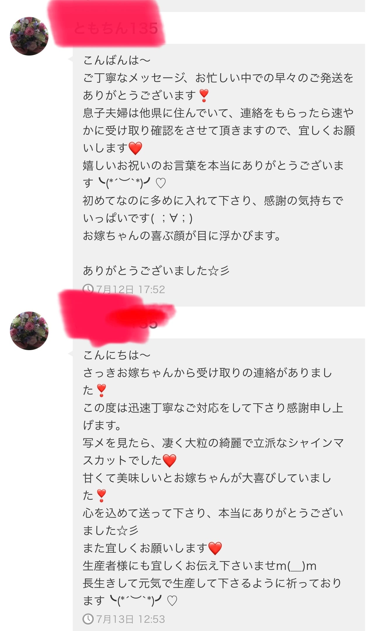 購入前必ずプロファイル、商品説明読んでください。 岡山県シャインマスカット 農林大臣賞2度入賞 特別芳純な香り 贅沢な甘さ 絶品 多くの美味しい汁が口の中で広がる もれなく美味しいです。 自身あり! パリッとした食感が特徴 無農薬 2-4房1.5kg 秀品 糖度16度以上 無農薬の栽培はすごく難しく、私どものブドウは農薬で色味や形を整えたブドウと違い、自然の中で手間をかけて栽培しております。房の中小さい粒も挟んである、シミ等ご理解頂いた上でのご購入をどうぞ マスカットを育て始め70年余り、今年92歳になる上松美智夫さんは、今も新しい栽培方法を模索し続けています。 20アールのガラスハウスで、心を込めて良い葡萄を栽培しています 一度食べたら忘れられない、この希少高級葡萄の衝撃の美味しさを体感してください 従来のぶどう栽培の常識を飛び越えた栽培方法に成功しています。葡萄は皮ごと口に入れて食べるもの、それを食べて健康になって欲しい、栽培期間中はジベレリンのみ使用した栽培で生産されているので皮ごと召し上がって頂けるよう安心を心掛けております ■注意 ★常温発送。クール便を検討の方、購入後、取り引き画面に住所名前電話教えてください、クール便着払いになります。 到着日や時間指定希望の方は購入後の取り引き画面コメントしてください ★商品を受け取られ問題が無い場合は速やかに受取評価をお願いします。受取評価の遅い方は次回からのお取引はご遠慮ください ★生ものですので、キャンセル返品、返金、交換等は致しません。 ★配送の途中に振動で粒が破裂し、そこから腐敗して行く場合があります。それなりに多めに入れてます、製品が届きましたら確認して、腐敗箇所がある場合は、取り除き一度水洗ってから冷蔵庫で冷やしてお召し上がり下さい。 ★★ 毎日の注文が多く、返事が遅くなる事や、間違う事があるかもしれませんが、何かありましたらメルカリ事務所と連絡してください。取り引き画面で相談しても良いです。 以上の事をご理解頂いた上でのご購入をお願いします。ナマモノですのでくれぐれも神経質な方、完璧なものをお求めの方はご遠慮下さい