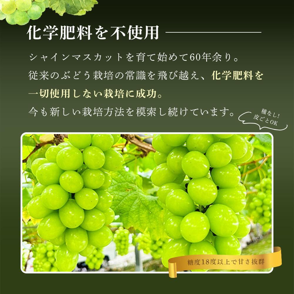 従来のぶどう栽培の常識を飛び越えた栽培方法に成功しています。葡萄は皮ごと口に入れて食べるもの、それを食べて健康になって欲しい、栽培期間中はジベレリンのみ使用した栽培で生産されているので皮ごと召し上がって頂けるよう安心を心掛けております