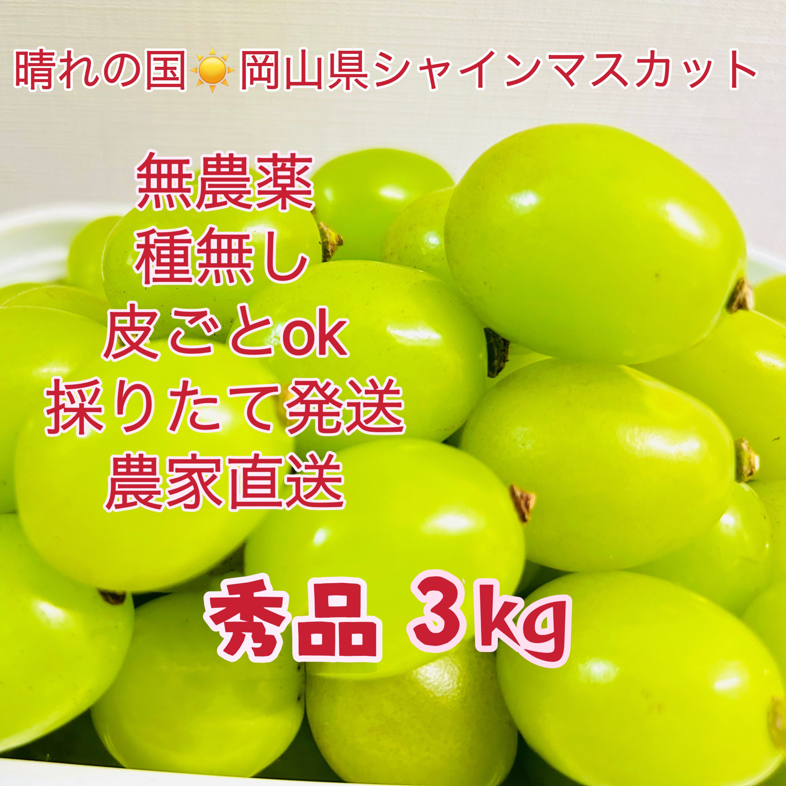 岡山シャインマスカット 無農薬 3kg 大粒秀品 粒だけ 完熟糖度16以上 パリッとした食感 特別芳純な香り 贅沢な甘さ絶品 温室シャイン